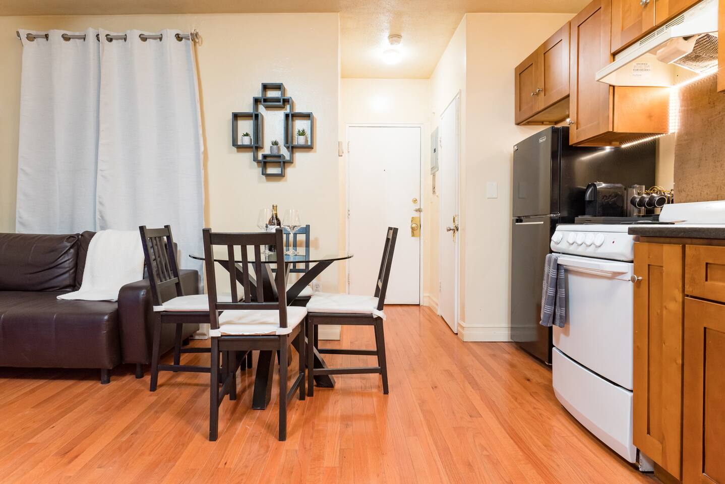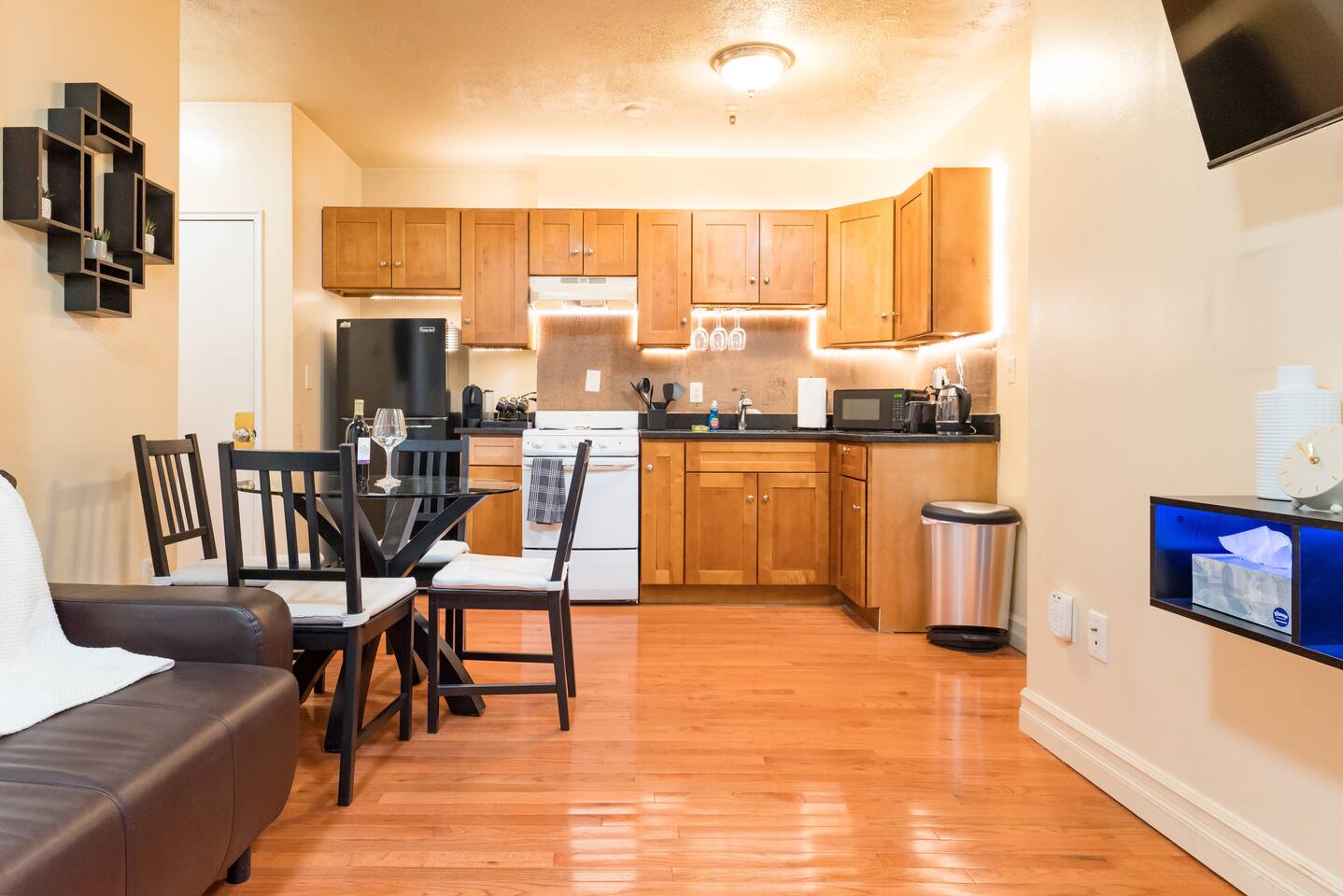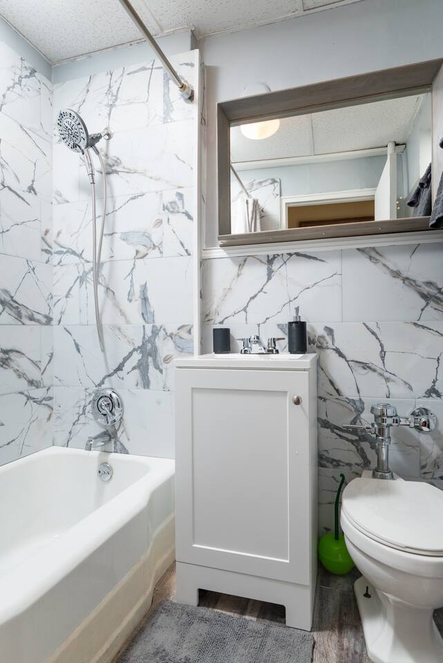 The 1br apartment itself is modern, very cozy atmosphere. It's equipped with a queen size bed! Making it the perfect place to rest after a hard day working or touring all of Boston, while the bathroom is equipped with a shower and tub. The kitchen is equipped with all the necessary appliances and a small area for cooking. The comfy open space is perfect for relaxing after a long day, with plenty of seating and a large 55’’ HD LED Smart TV!