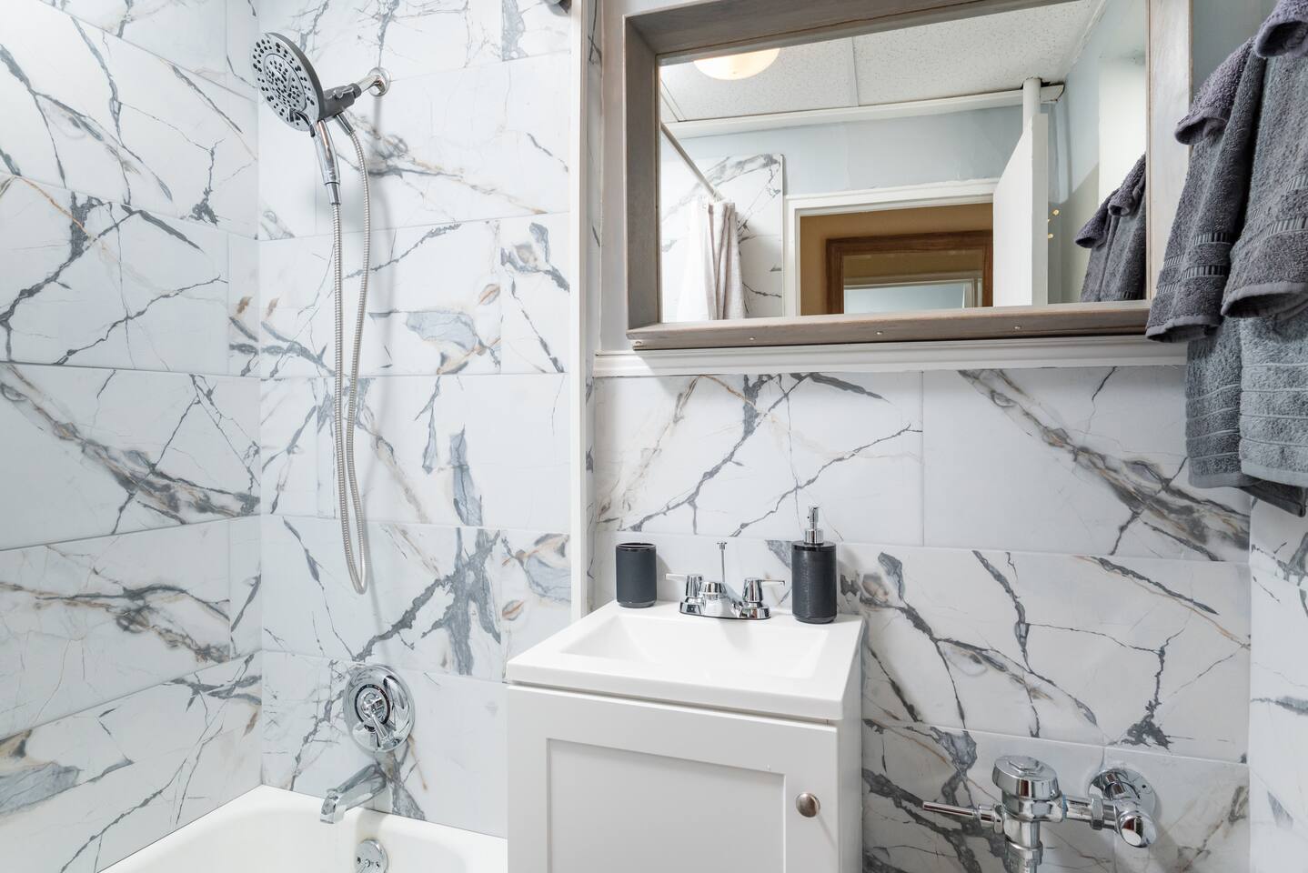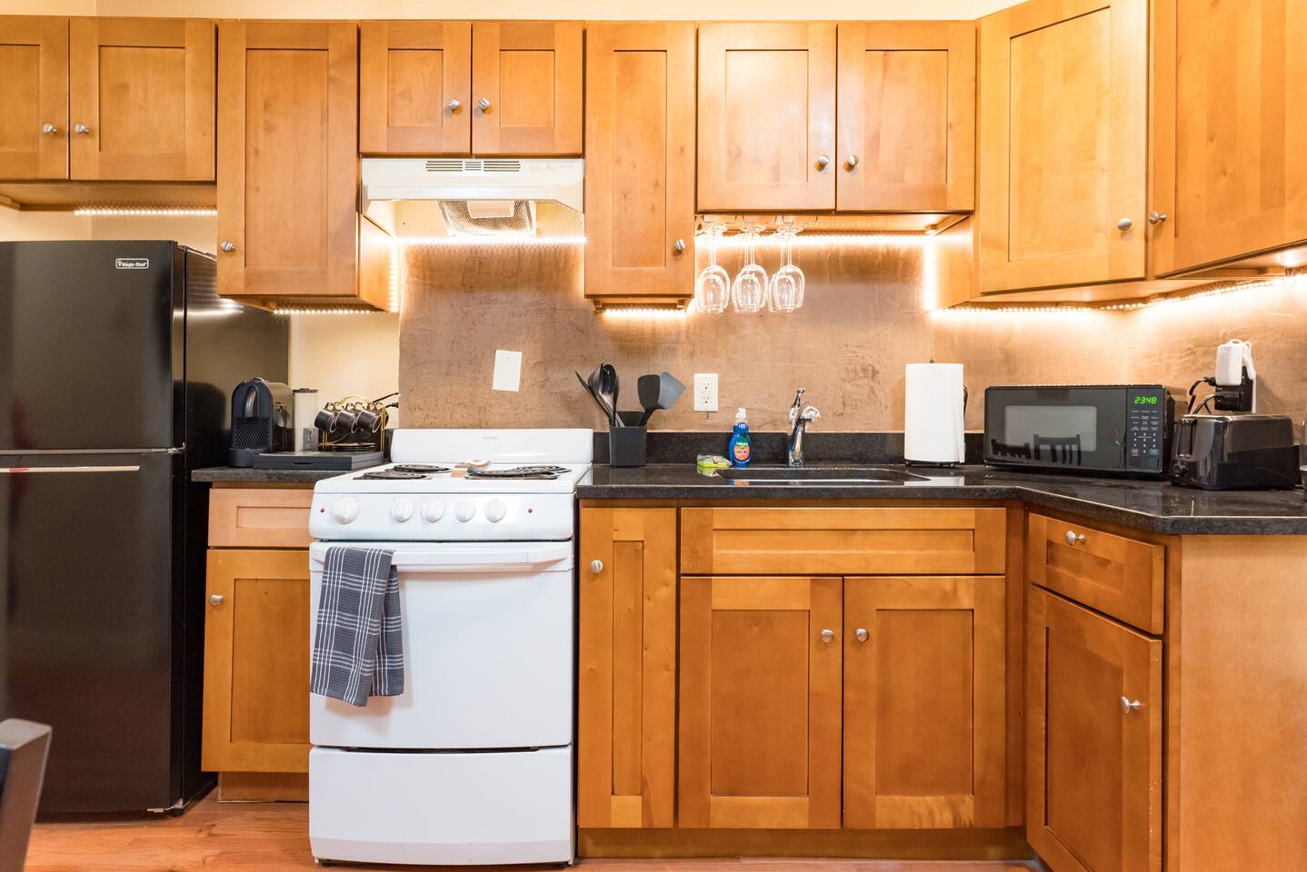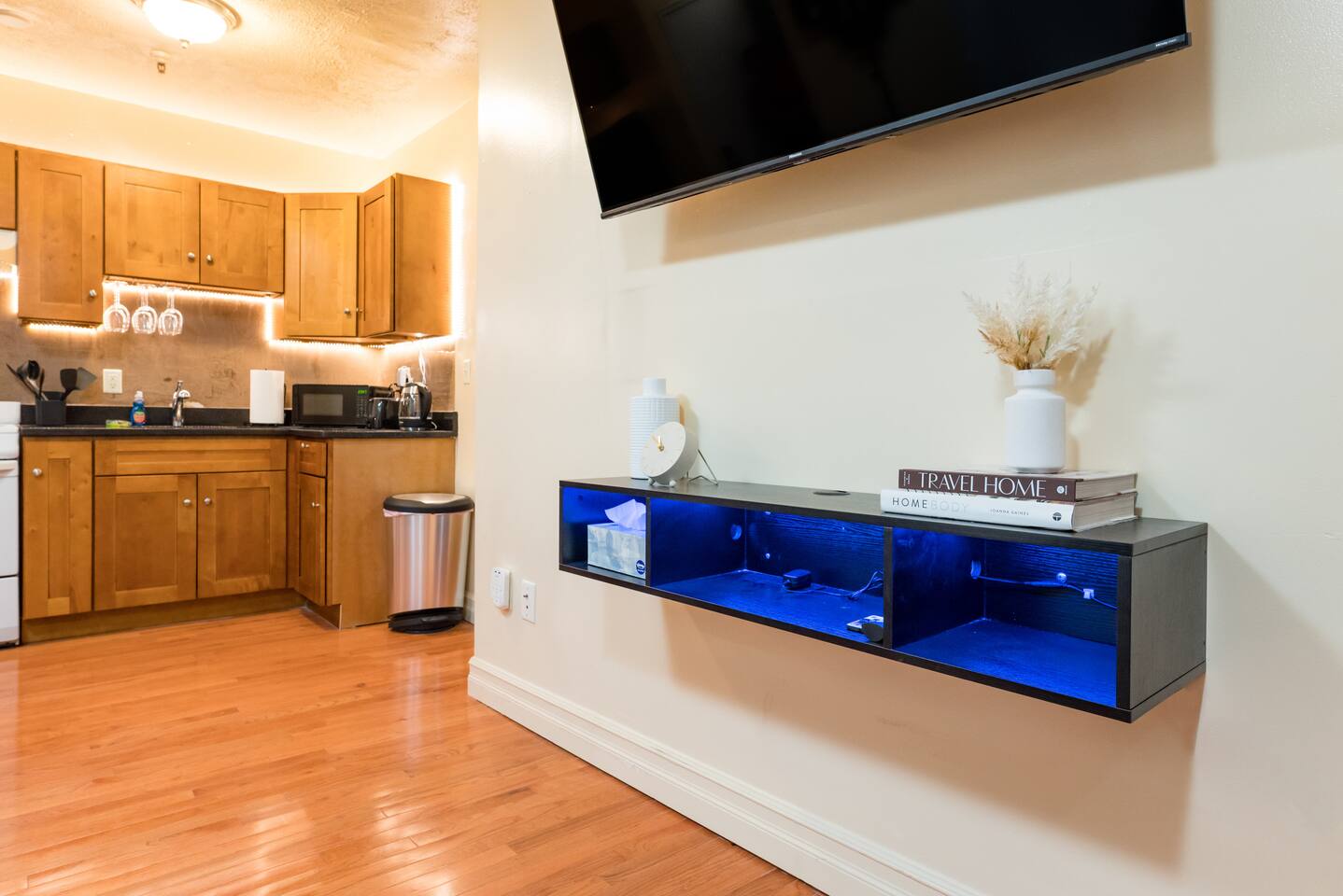 The 1br apartment itself is modern, very cozy atmosphere. It's equipped with a queen size bed! Making it the perfect place to rest after a hard day working or touring all of Boston, while the bathroom is equipped with a shower and tub. The kitchen is equipped with all the necessary appliances and a small area for cooking. The comfy open space is perfect for relaxing after a long day, with plenty of seating and a large 55’’ HD LED Smart TV!